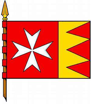 En la bandera predomina el color rojo con una gran Cruz de Malta a la izquierda. La parte derecha son dos bandas en zigzag rojas y amarillas.